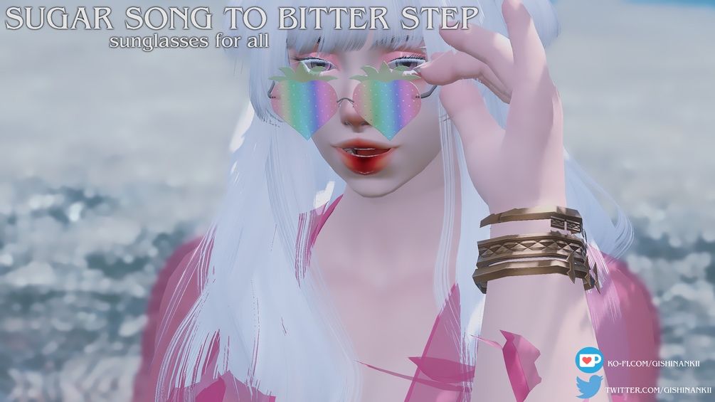 Made using 3DS, Blender, Photoshop, Substance Painter Strawberry sunglasses for all races/genders. Pink version is dyeable, rainbow version is diffuse. Replaces Endless Summer Glasses